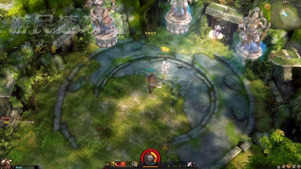迎來最後的BOSS,增長天王,這個boss也分為2階段,第一階段,常用技能有,普通攻擊、石突刺以及一個藍色的圈圈,在藍色圈圈範圍之內你會眩暈一段時間,要小心這個技能,防不勝防,最好保持一點距離,之後石突刺,基本上可以說是無線距離的技能了,非常遠,但是方向單一,之後還剩大約15排血會變成一道旋風,場景四角開始生小怪,清理這些小怪,注意繞著旋風走,他行動不算很快,但是你要去撞打到還是很疼的!清完小怪他變回來了,之後還剩5排血再一次變身,還是一樣的,之後就可以幹掉他了,只要不硬抗還是很簡單的!