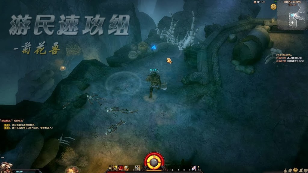 進入白骨洞之後,出現幾隻小怪,可以秒掉,不用多說。往前走出現藍色的屏障,穿過去,這裡打boss,最左邊的2個火盆,毀掉之後boss出現,這個boss血不多,只有4排血,攻擊速度也比較慢,對其進行猛攻是比較好的選擇,但是要注意他頭頂上的數字,倒數完畢之後會爆炸,如果用的牛魔就沒事,可以用數位鍵3上的技能,這個技能可以把攻擊速度變得超快而且有吸血效果。
