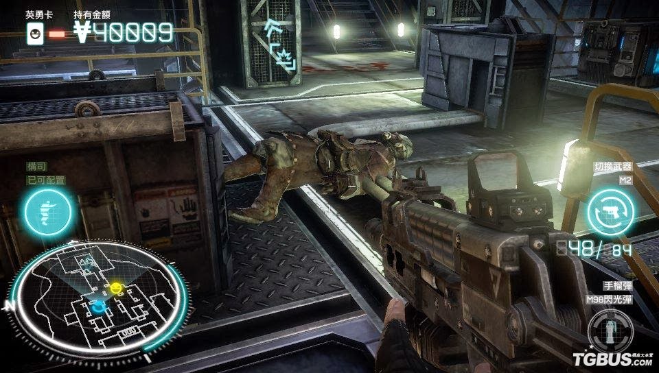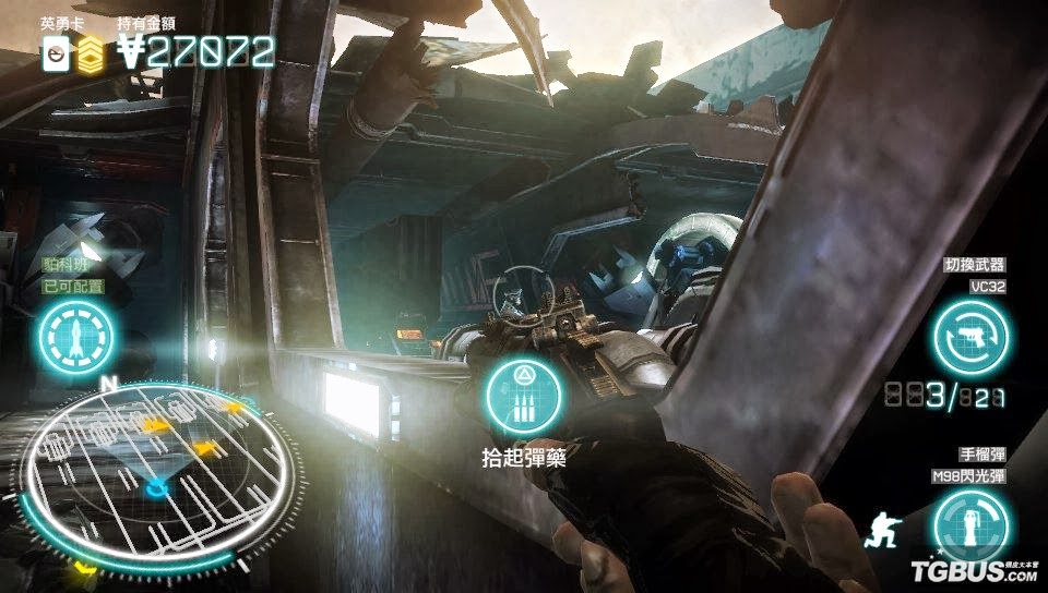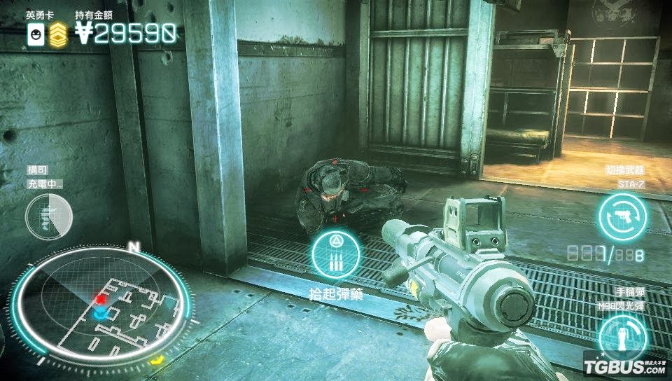 兩名重裝步兵,狹小空間簡直地獄——於是我守在武器箱旁邊花錢拿導彈轟。搞定後別急著走,柱子背後也有一個情報終端。