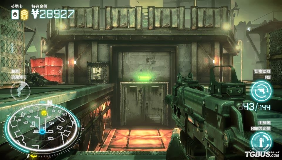 進入基地內部。分兩道門,分別是圖中的下門,以及旁邊樓梯爬上去平臺前進的上門。這裡選擇先走下門。
