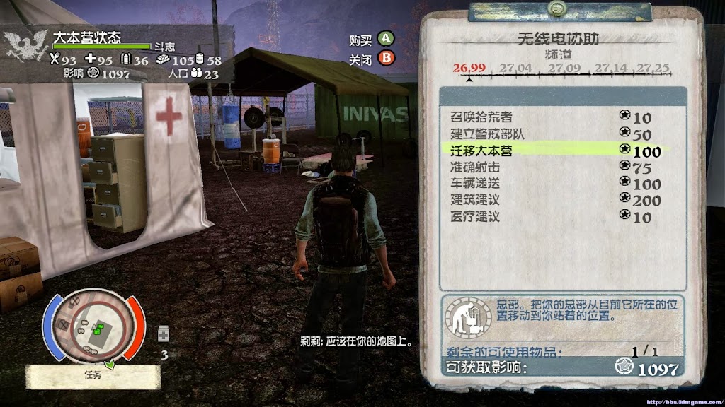 前提:你必須跟著主線走,才會有遷移大本營的選項(有個NPC跟那個電臺妹子說,教堂太小他想換地方,你跟他出去看完地皮後才會有遷移大本營選項