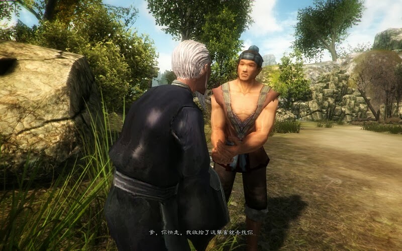 回到村子遇到一白髮老翁,對話中我們得知兩人似乎都是天上下來的神仙, 妖魔之王混沌即將覺醒,需要找到兩把神劍和主角的武器融合才能擊敗他。一路前進便可出村子。路上可以拾取驢肉包子加血,遊戲各種特殊技能都是費血的,一段時間能自動回復,當然被敵人打掉是無法回復的。