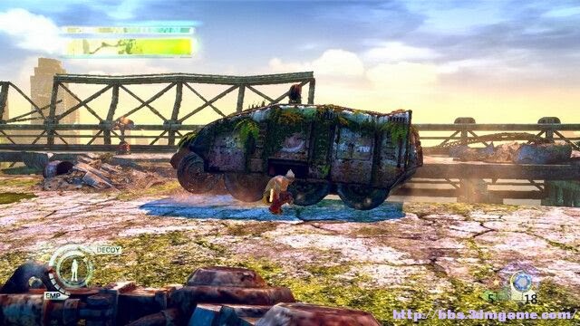 目的地不算遠,但是由於地形破壞的厲害只能通過遠處的吊車過去了第一個場景目的地是左上角那裡,這裡有機器人,注意讓三藏做誘餌自己繞過去,拆掉機器人,這裡敵人又護盾了用攻擊蓄力可以直接打暈對手,然後按E拆除機槍去掃射其他敵人。