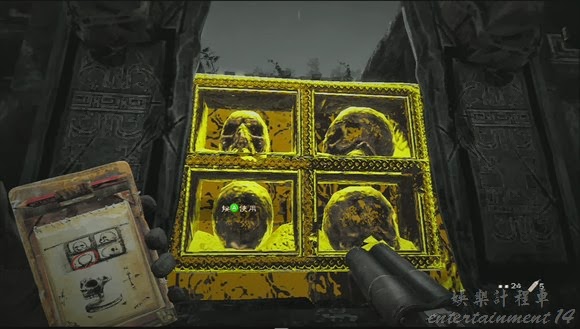 之後小心路上的地雷一直走,到一個有兩根把手的門口後,先按下骷髏再去轉動把手,門就會打開。之後是boss戰,這裡有不少的雜兵,打不打死隨便,在出生地的左邊的一個相對安全的地方有炸藥,拿走炸藥直接在boss所站的平臺下面安放炸藥就好了。之後進洞,打敗門口的守軍之後用槍打斷天上的繩子使木板落下得以進入洞穴深處,之後找到如圖所示的一尊石佛後,按照右上-上中-下中-下左的順序觸發陷阱。之後的大廳沒有什麼解密的內容,一直走就行了,注意路上的喪屍。之後到重組碎片的地方了,這裡先按下(或者是上)-左-左-左就可以了,調成如圖所示的圖案後劇情。(貌似,有點記不清了= =不好意思)。