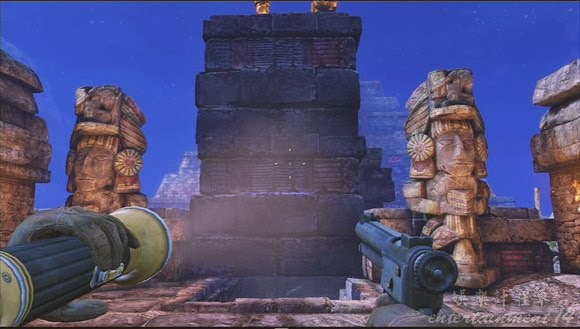 在瑪雅城市內沒有什麼特別難的解謎,除了boss戰門前的那個解謎比較麻煩。還有就是路上會遇見速度快體積大的敵人,這裡要朝著他的腹部處的紅色部位射擊,(這遊戲射擊操蛋的很,反正打這玩意的時候就蛋疼吧)到了boss戰門前,有四個石柱子,在上面有一個盤子,這裡要使四根柱子在同一水平線上,左右兩邊的柱子無論下落還是上升都是以兩個為一個單位的,中間的兩個石柱子是一個,而柱子的初始高度是三個,所以要最右邊的石柱子開始先按下兩次,之後就很簡單了。