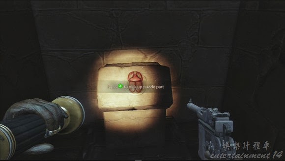 劇情後玩家處於墓穴中,手無寸鐵,先找到一個引爆器把門炸毀,之後是解密,跟前面一樣,最上面的那個長方形不要照,最下麵點亮兩顆就行了。
