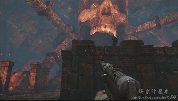 之後是boss戰,很簡單,他在上面亂扔大便就不理他,跑路。跟玩家對射了直接射死他。不久後進入階段二,這裡在地上會有一把RPG能撿撿起來轟斷支撐巨大骷髏頭兩邊的石柱子,彈藥打光了沒事,可以補給的。轟斷兩邊的石柱子後,boss戰結束。